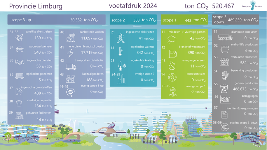 - Totale zogenoemde ‘voetafdruk’, ook wel de totale CO2 uitstoot van de provinciale organisatie bedraagt 520.467 ton CO2 (referentie jaar 2024). Hiervoor is de CO2 prestatieladder methodiek gebruikt.