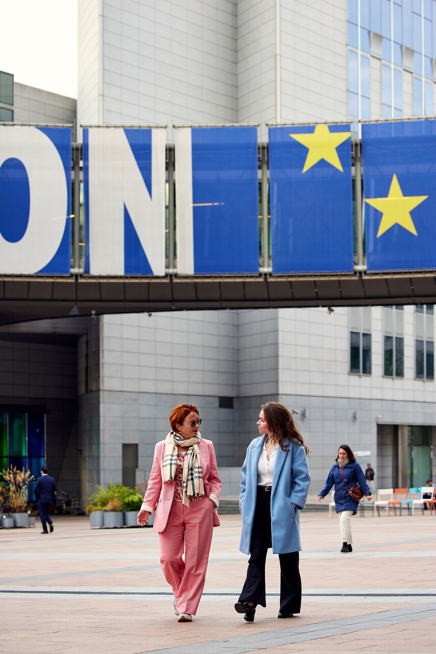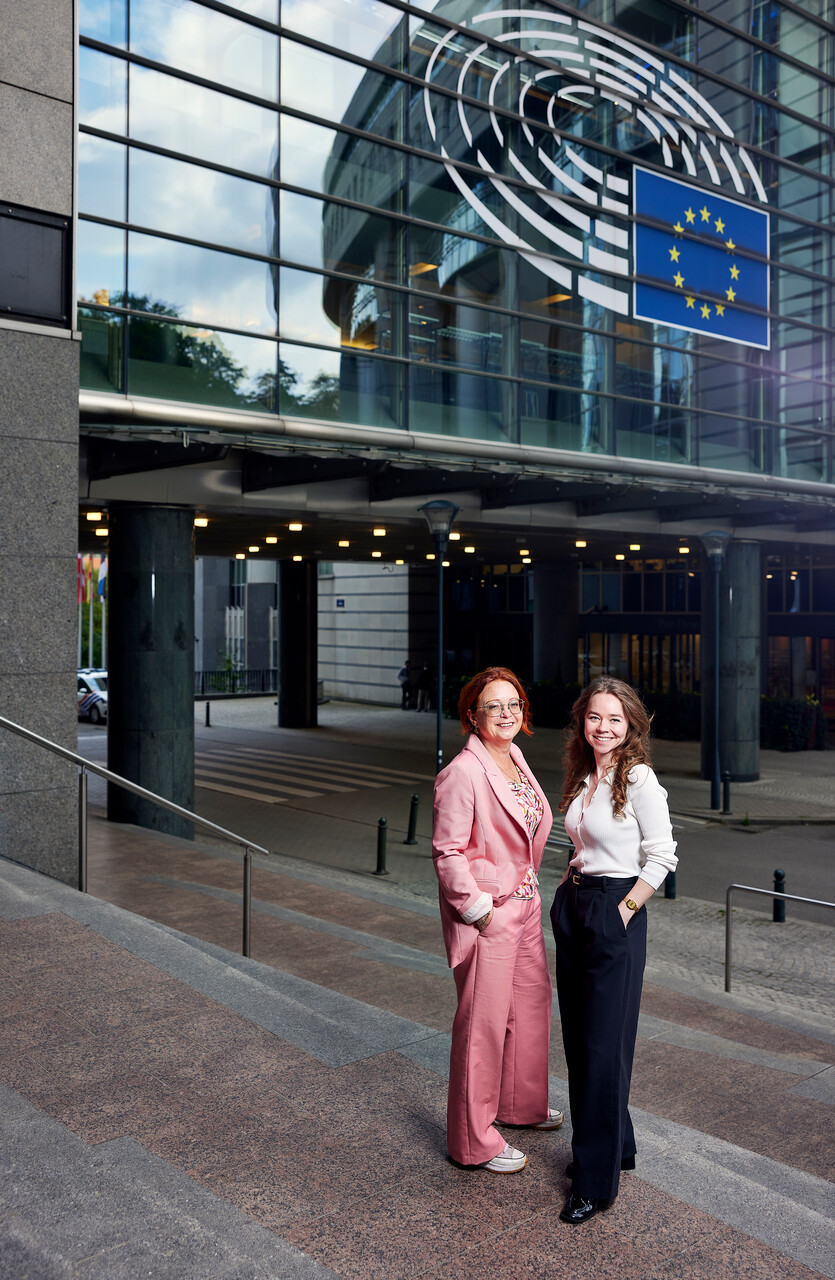 Jacqueline en Laura voor de ingang voor het Paul-Henri Spaakgebouw van het Europees Parlement