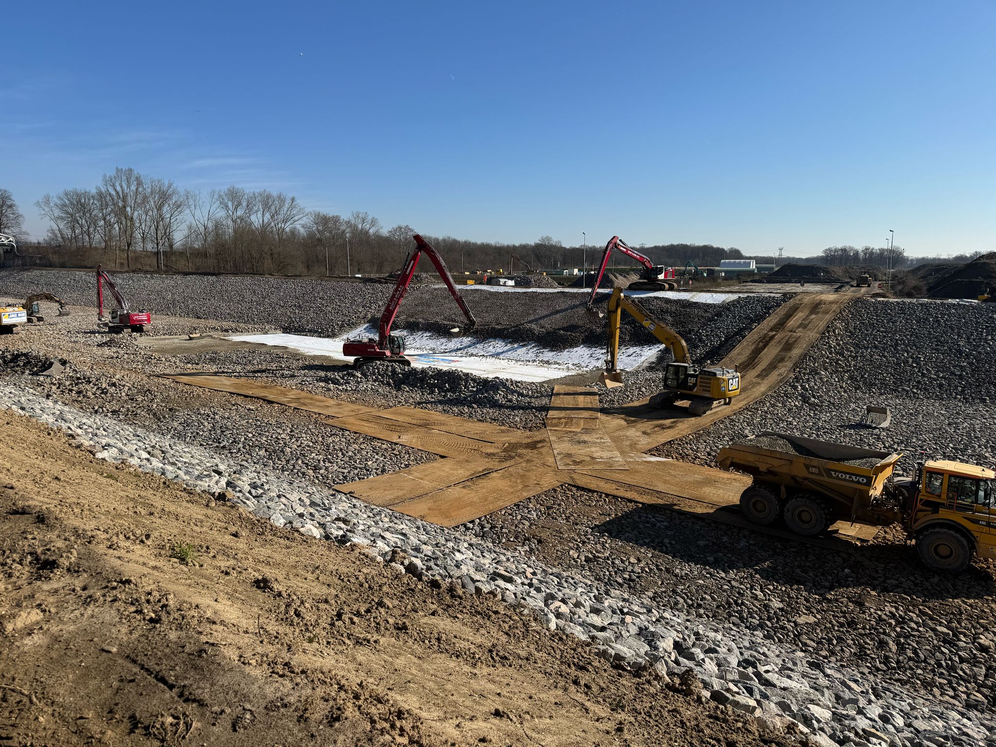 - Rijkswaterstaat maakt het werk af: ze brengen de laatste matten en stortstenen aan.