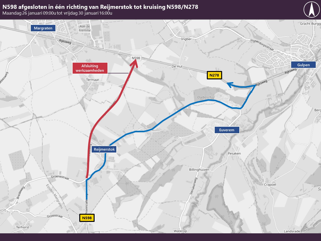 Wegens spoedherstel van een uitspoeling in de berm wordt de N598 bij Ingber op maandag 26 januari 09.00 uur tot vrijdag 30 januari 16.00 uur afgesloten voor gemotoriseerd verkeer in de richting van Margraten/aansluiting N278. Fietsers en voetgangers hebben doorgang. Het herstel is noodzakelijk om de veiligheid van het verkeer te waarborgen.