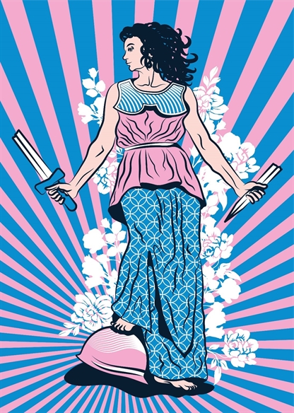 Nu zien we haar zoals ze echt is. Ze staat hoog, op een grote globe – de aarde zelf haar podium. Met beide voeten stevig geplant op de wereld. Vastbesloten. Haar vuist geheven in de lucht, krachtig en onverzettelijk. Haar mond wijd open in een schreeuw die je bijna kunt horen, ook al is het stil. In haar andere hand een megafoon, symbool van de stem die ze weigert nog langer in te houden.